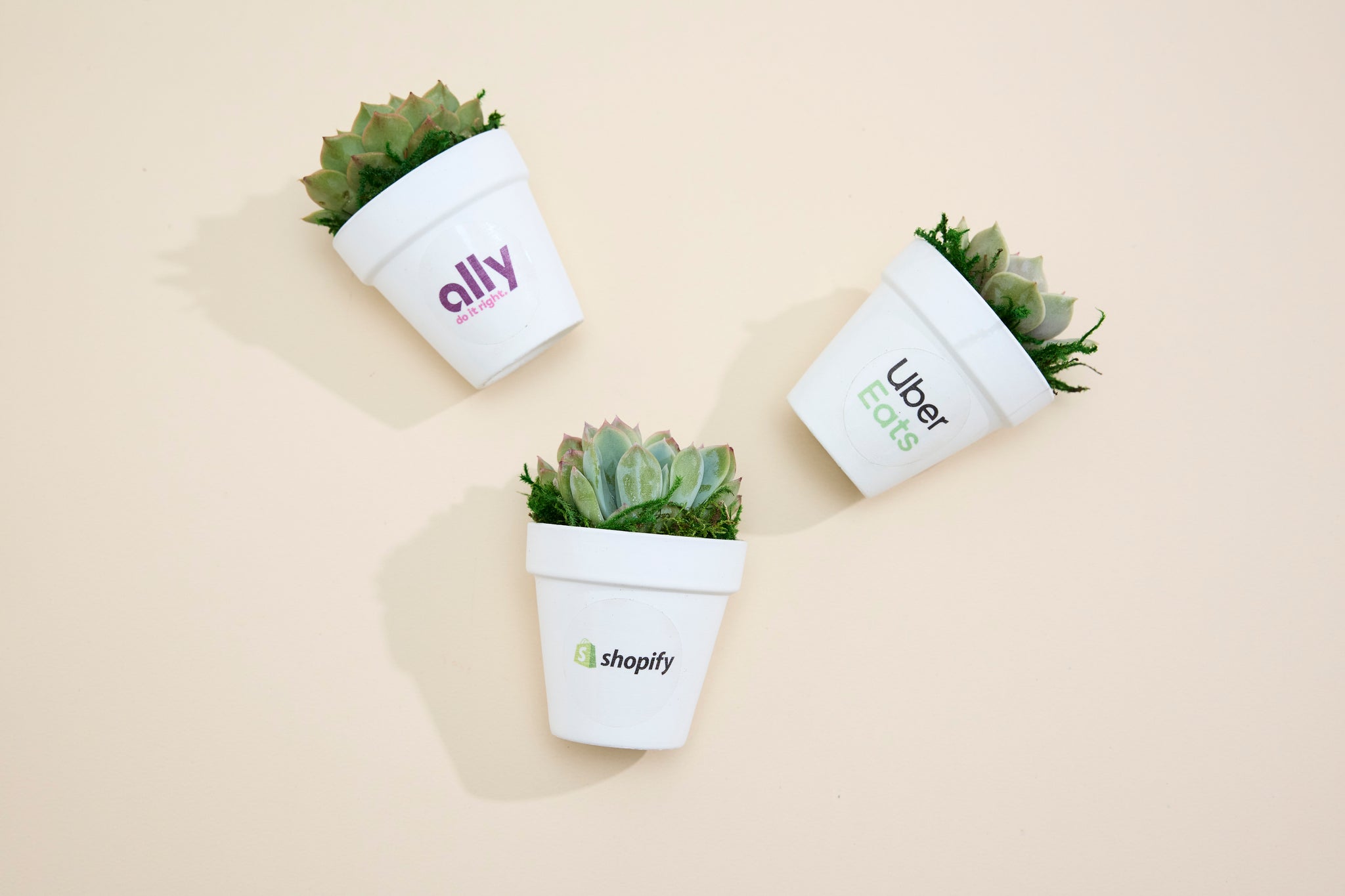 Put your own logo on it! Vibrant living succulent topped with preserved moss--set in a beautifully crafted white clay planter. Comes with a cute watering instructional card